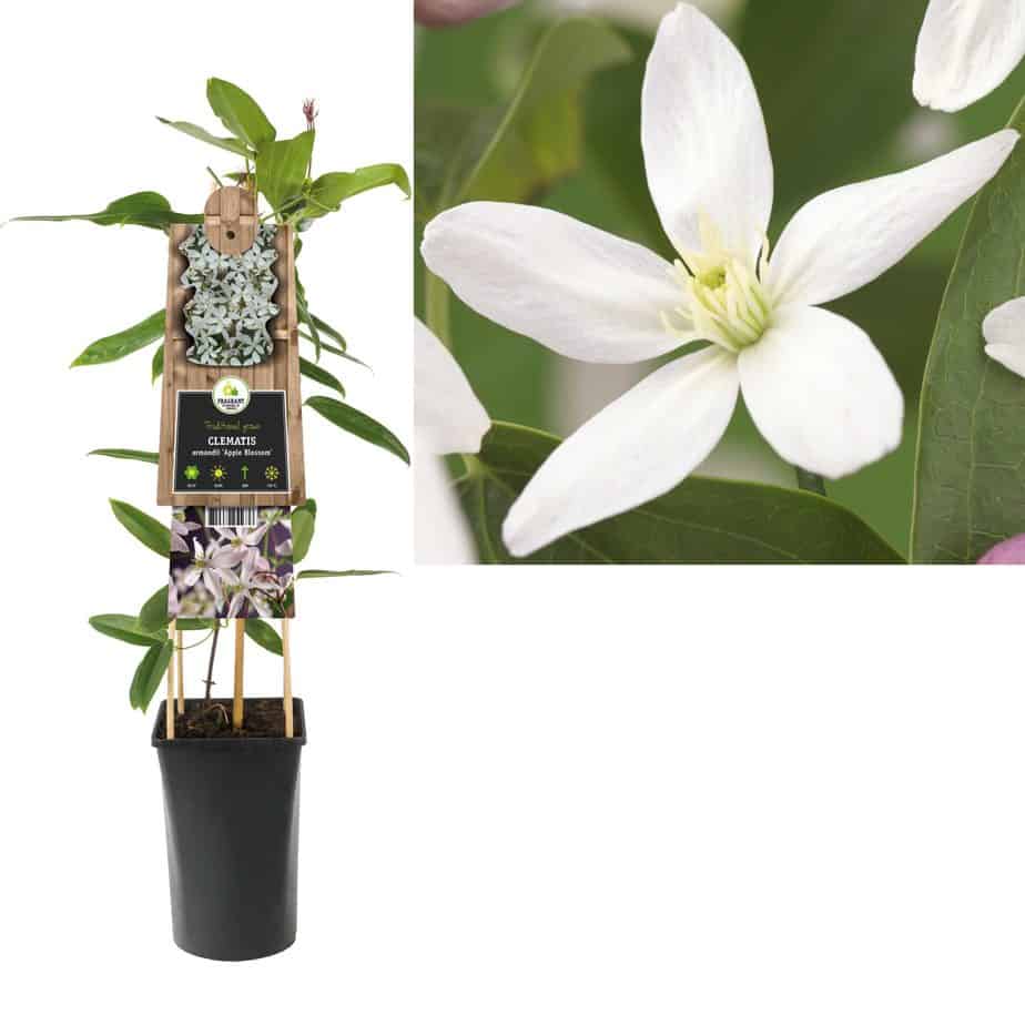 De Clematis armandii Apple Blossom is een wintergroene Clematis. Deze klimplant bloeit in het vroege voorjaar in de periode van maart tot april met heerlijk fruitig geurende bloemen. Door de kleur van de bloemen lijkt het op Appelbloesem, waar dus de naam vandaan komt.