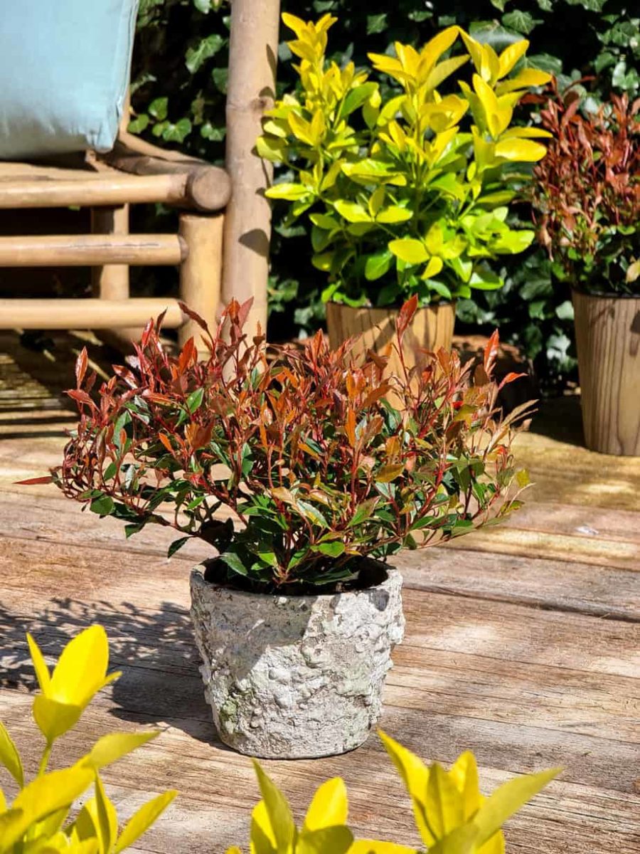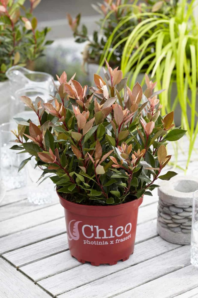 Photinia Chico heeft prachtig, bronskleurig nieuw schot en een mooie, bolvormige groeiwijze. Met zijn fijne blad en compacte vorm van 30 cm hoog en 20 cm breed is de Chico jaarrond een plaatje in de tuin, border, als solitair en in gemengde containers. Daarnaast is Chico goed toe te passen als lage heg of massabeplanting. Deze sterke Photinia vertakt gemakkelijk en heeft geen last van takkensterfte. Plant Chico in de volle zon of halfschaduw in een vruchtbare, goed waterdoorlatende grond. Snoeien kan in het voorjaar of de zomer.