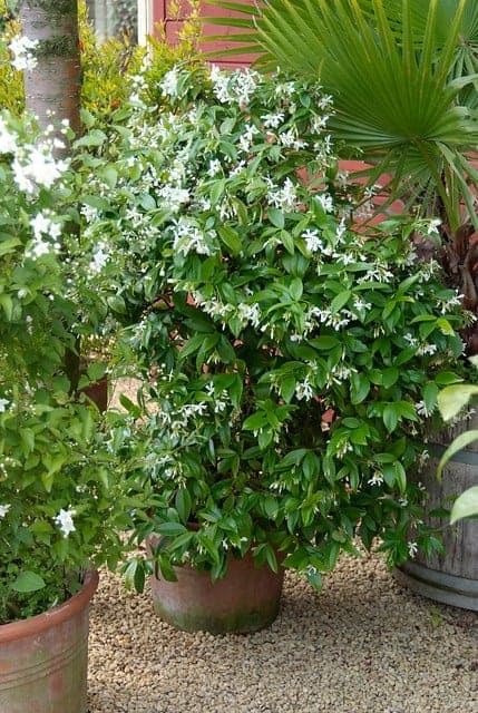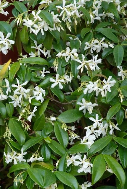 Trachelospermum jasminoides wordt in het Nederlands Sterjasmijn of Toscaanse Jasmijn genoemd.