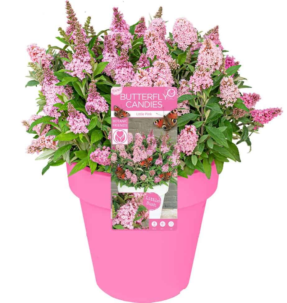 De Buddleja davidii butterfly Candy ´Little Pink´ is een nieuwe dwergvlinderstruik. Met zijn intense kleuren en compacte groei past hij in elke tuin. De Buddleja davidii butterfly Candy ´Little Pink´ kun je zowel in pot als in de volle grond plaatsen en is een ware trekpleister voor vlinders! Van juli tot oktober bloeit deze vlinderstruik met prachtige roze bloemen.