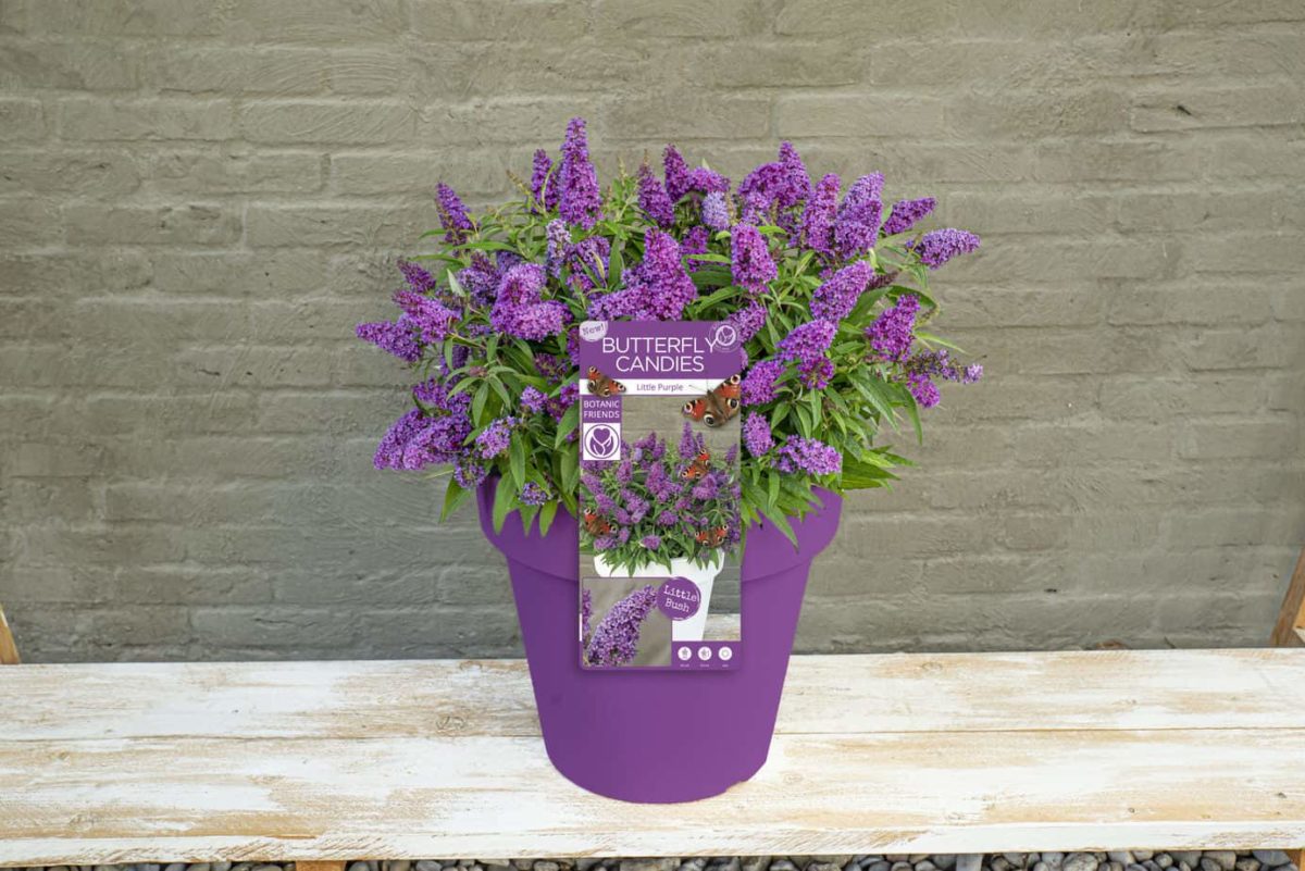 De Buddleja davidii butterfly Candy ´Little Purple´ is een nieuwe dwergvlinderstruik. Met zijn intense kleuren en compacte groei past hij in elke tuin. De Buddleja davidii butterfly Candy ´Little Purple´ kun je zowel in pot als in de volle grond plaatsen en is een ware trekpleister voor vlinders! Van juli tot oktober bloeit deze vlinderstruik met prachtige paarse bloemen.