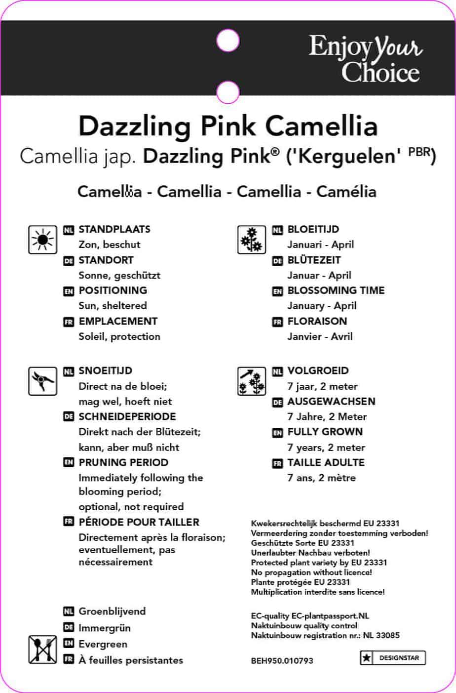 Camellia japonica “dazzling pink”, syn. “kerguelen” is een bontkleurige, wintergroene sierheester met een compacte, bossig opgaande habitus. De glanzende ovale bladeren zijn donkergroen gekleurd en attractief roomkleurig getekend. Deze camellia bloeit van februari tot begin april met dubbele dieproze bloemen. Hij houdt van een beschutte standplaats in de halfschaduw of schaduw en een zure tot neutrale goed doorlaatbare grond. De plant is op een beschutte standplaats redelijk winterhard, verdraagt goed zeewind en luchtvervuiling, is goed ziekteresistent.