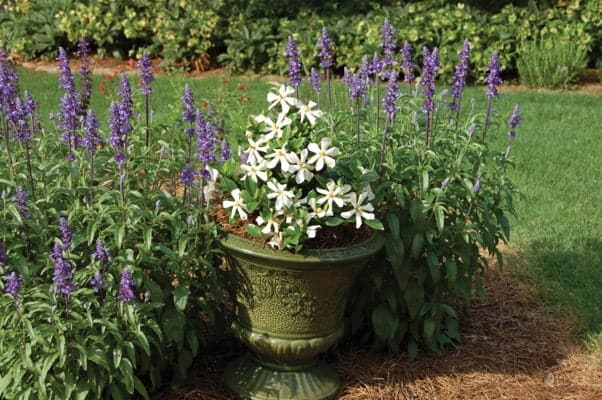 Gardenia Pinwheel heeft grote, geurende, sneeuwwitte, enkele bloemen in de vorm van een windmolen. Deze unieke vorm valt op tegen de glanzende, donkergroene bladeren. Pinwheel bloeit in het late voorjaar tot de vroege zomer en soms nog een keertje in de vroege herfst. Gardenia Pinwheel heeft een compacte, ronde habitus en wordt ca. 75 cm hoog en breed. Plant Pinwheel in de zon of halfschaduw in een humusrijke, vochtige maar goed doorlaatbare bodem. Geef in de zomer extra voeding. Pinwheel is een prachtige plant voor landschapsinrichting, massabeplanting, voor in de heesterborder of voor in een pot op balkon of terras. Deze groenblijvende heester is winterhard tot -10 ºC.