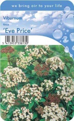 Viburnum tinus Eve Price is een groenblijvende heester die ook luistert naar de naam Sneeuwbal. Viburnum tinus Eve Price bloeit in de winterperiode van november tot maart met licht geurende rozewitte bloemen uit de rode bloemknopjes. Wanneer er bestuiving heeft plaatsgevonden verschijnen er na de bloei zwarte bessen. Viburnum tinus Eve Price heeft een volwassen hoogte van 150 centimeter.