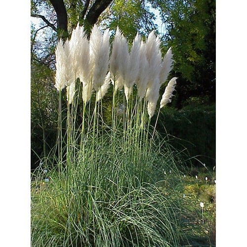 Cortaderia selloana of pampasgras is een prachtig siergras, waarvan zo´n vijftien soorten voorkomen. Oorspronkelijk groeit Cortaderia selloana op subtropische natuurlijke grasvlaktes (pampa’s) en in de bergen in Zuid-Amerika. Deze plant is tweehuizig; er zijn vrouwelijke en mannelijke planten. Dit type pampusgras bloeit van augustus tot en met november met langwerpige witte pluimen. De vrouwelijke planten geven de mooiste bloempluimen. De mannelijke varianten hebben grauwere en meer roze pluimen. De groeipiek is in september. Onder normale weersomstandigheden blijven de pluimen maandenlang mooi. De lange, smalle bladeren maken de sierlijke uitstraling van deze plant compleet. Tijdens periodes van regen en wind kun je de pluimen beschermen door de bladeren bij elkaar te binden. Cortaderia selloana is bestand tegen vorst, zeewind en luchtvervuiling. En heeft geen last van ziektes en ongedierte. De plant is niet volledig winterhard, heeft vooral in zijn jonge jaren extra winterbescherming nodig. Het siergras is in verschillende hoogtes en bloemkleuren te koop. De gemiddelde planthoogte is zo’n 210 centimeter.