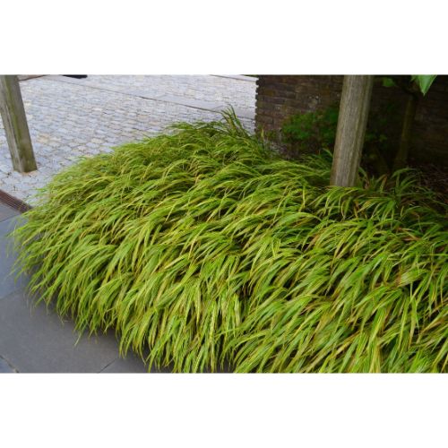 Hakonechloa macra Aurelola wordt ook wel bont Japans berggras genoemd. Dit siergras heeft overhangende smalle groengele bladeren. De bladverliezende tuinplant heeft een overhangende groeiwijze. De bloei van het Japans berggras is in de maanden augustus en september, de bloeiaren steken boven het siergras uit. In het najaar verkleurt het blad van dit siergras naar oranje voor het van de tuinplant valt. De volgroeide hoogte van Hakonechloa macra Aureola ligt rond de 30-40 centimeter.