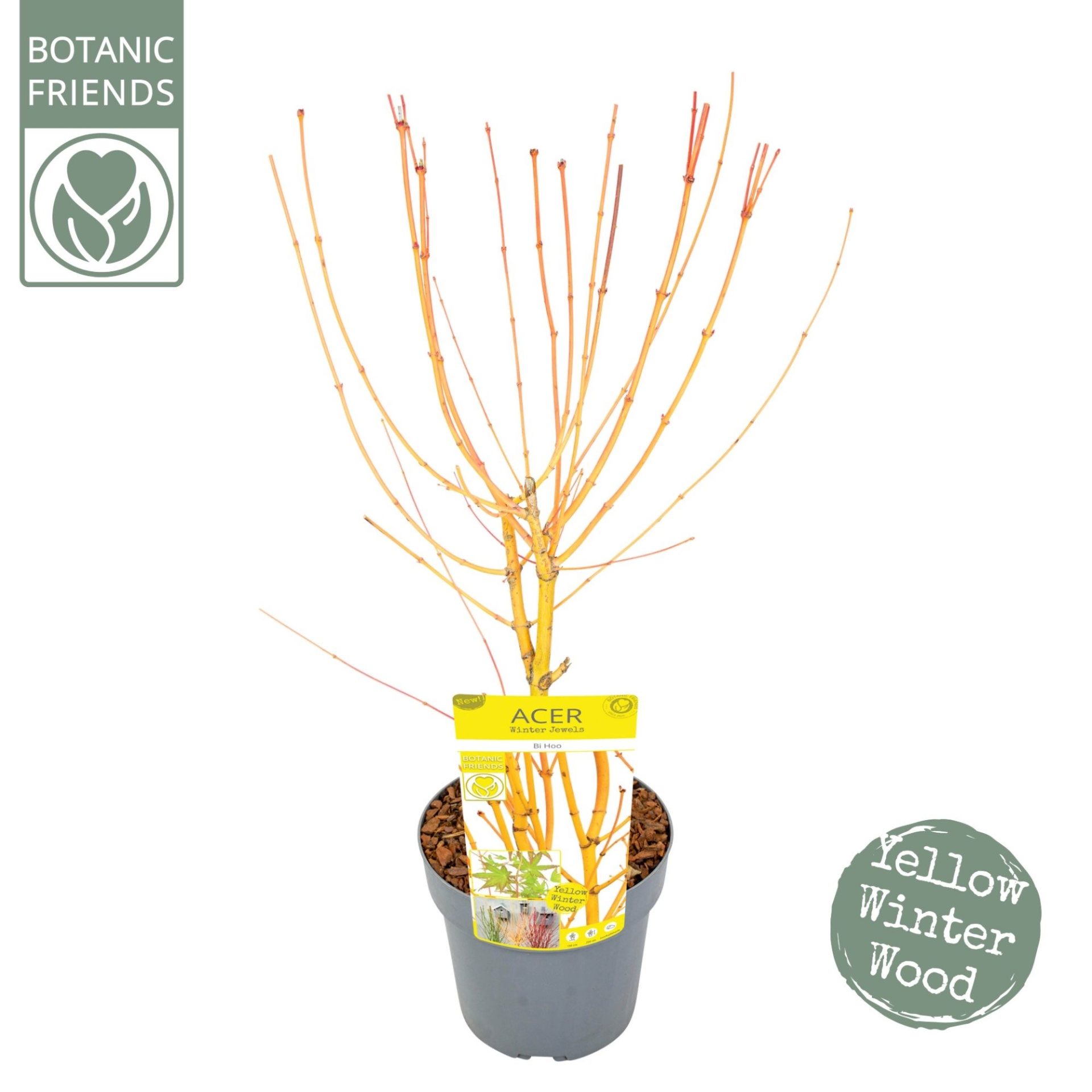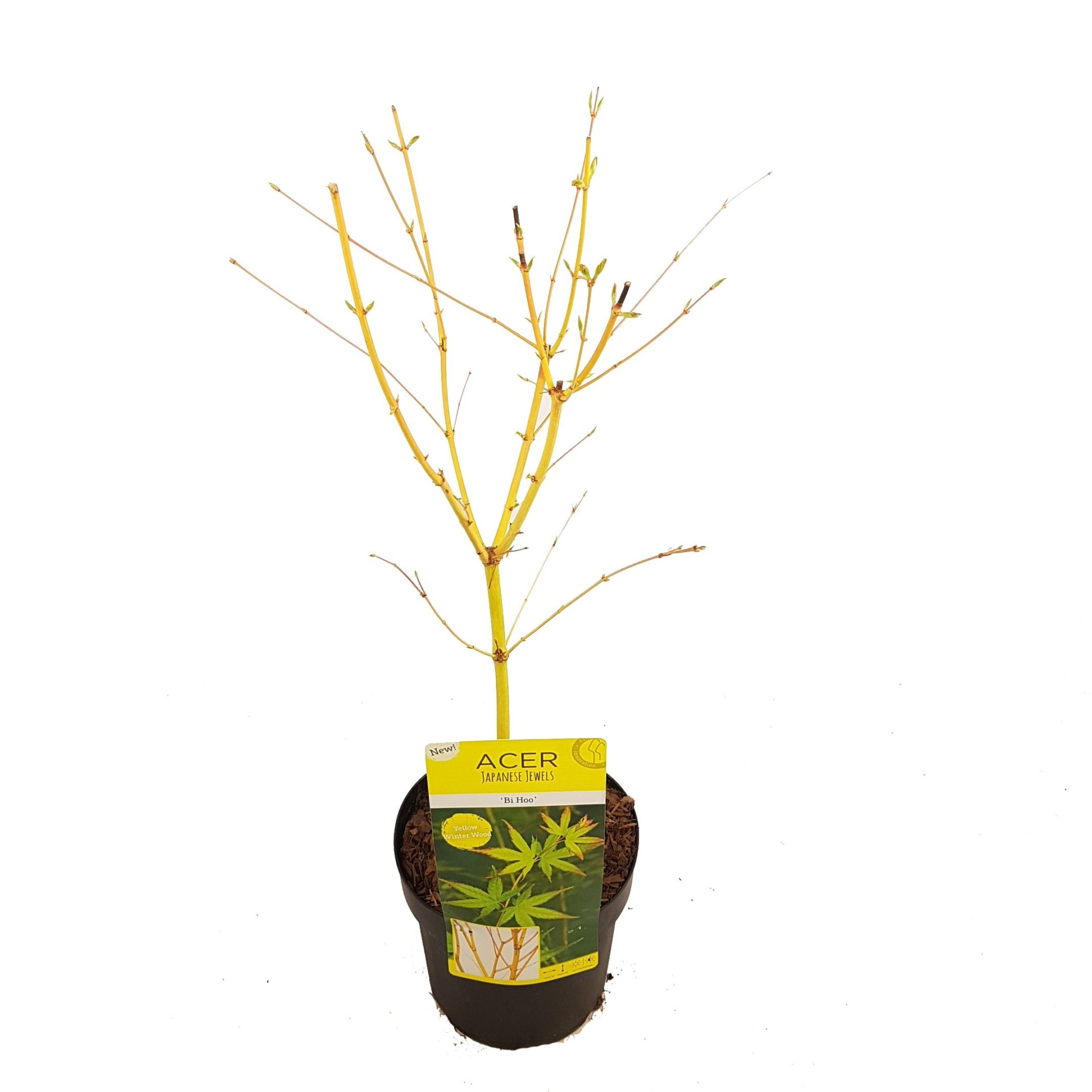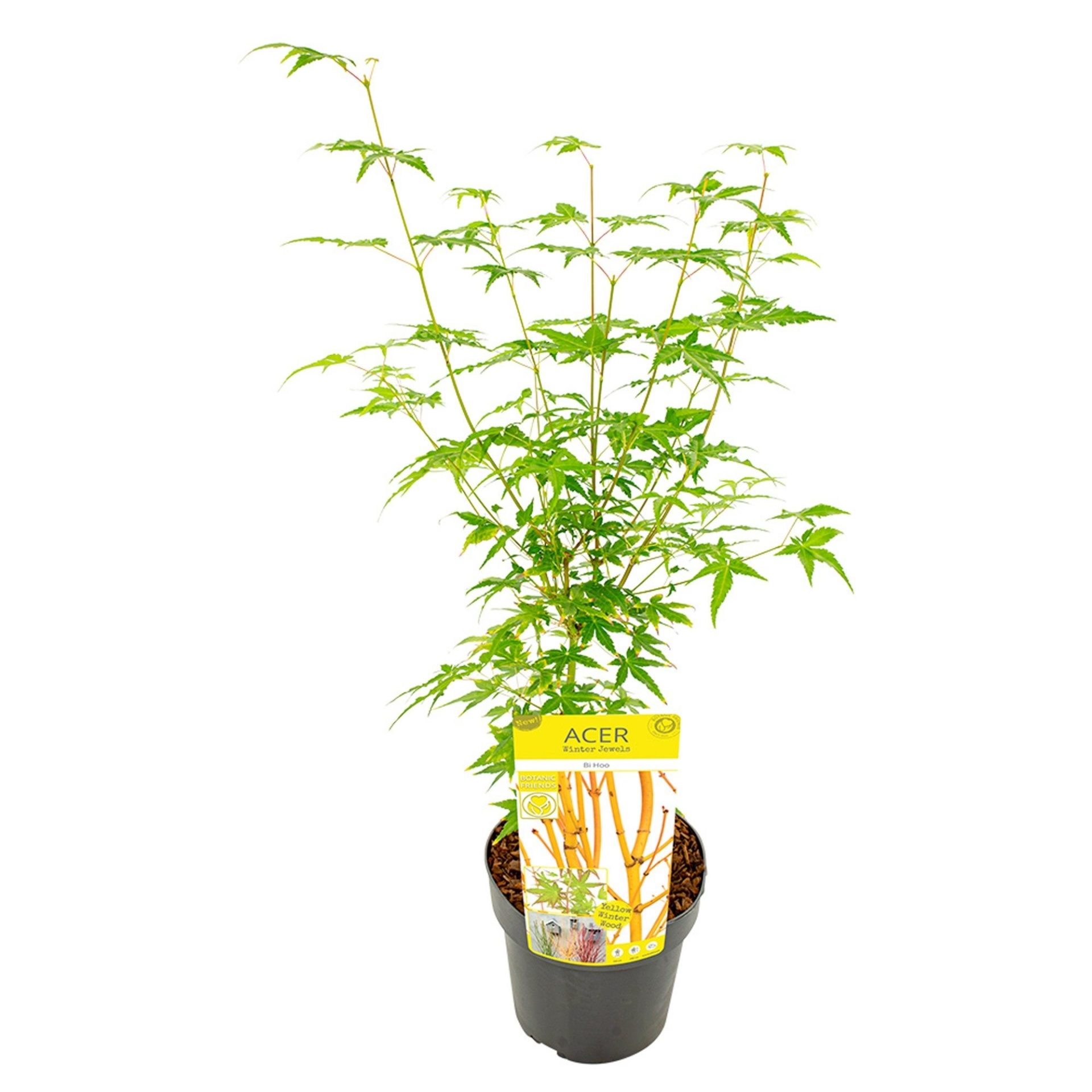 De Acer palmatum ‘Bi Hoo’ is een bijzondere Japanse esdoorn, deze heester met goudgele takken heeft frisgroen zomerblad dat in het voorjaar zalmroze uitloopt en in de herfst verkleurd naar oranje-geel. In de winter behoudt deze Acer zijn sierwaarde door de goudgele takken.