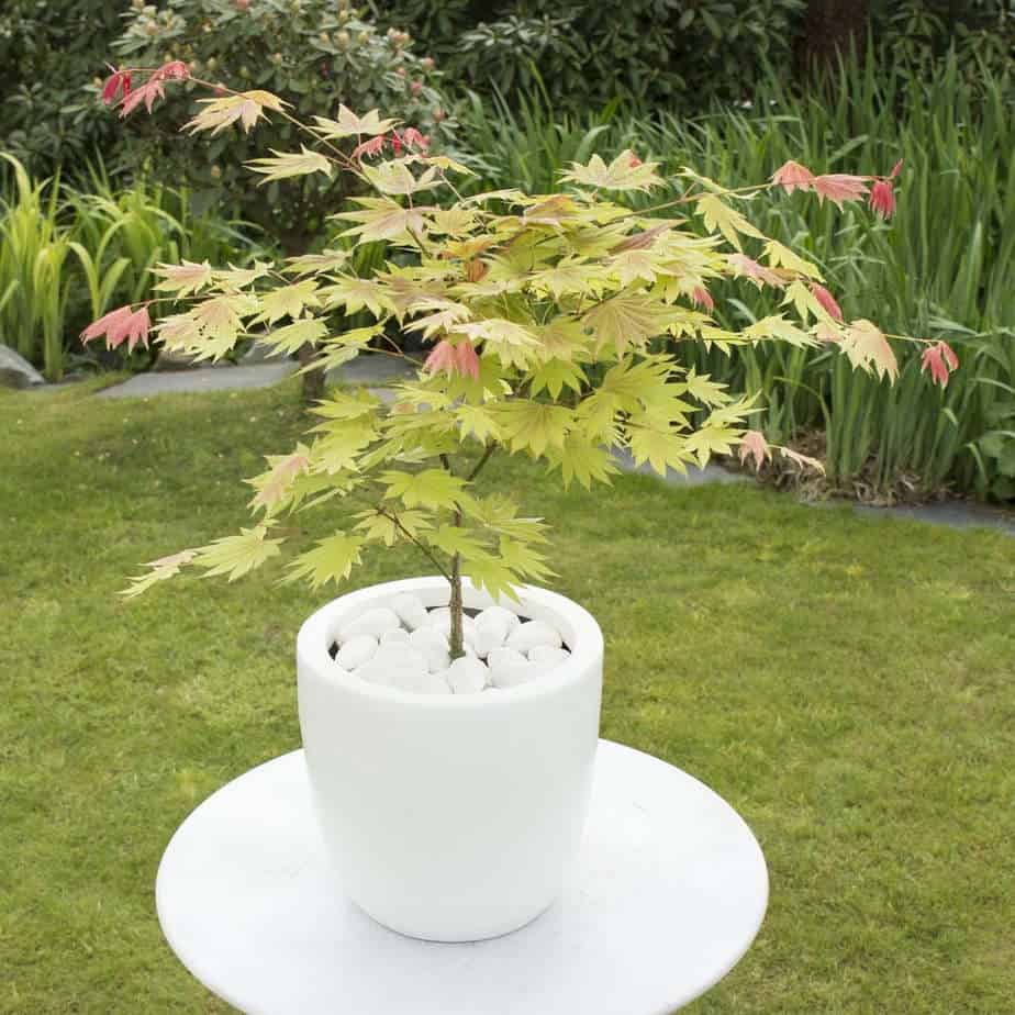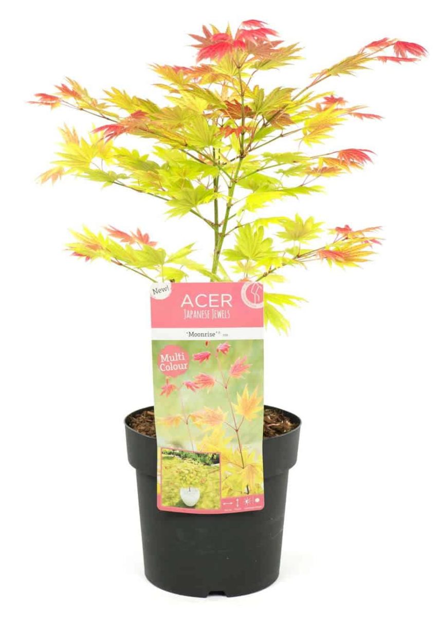 De Acer shirasawanum ‘Moonrise’ is een Japanse esdoorn met fraai gevormd blad dat in de lente prachtig oranje uitloopt. In de zomer kleurt het blad naar heldergeel om in de herfst naar roodoranje te verkleuren. Het is een rustige groeier met een tamelijk smal opgaande groeiwijze die na vele jaren 175 cm hoog kan worden. Snoeien is niet nodig, maar wil je wat knippen, doe dat dan in de nazomer of vroege herfst. Staat liever tussen 12 en 3 niet in de volle zon. Meng lekker veel potgrond door het plantgat