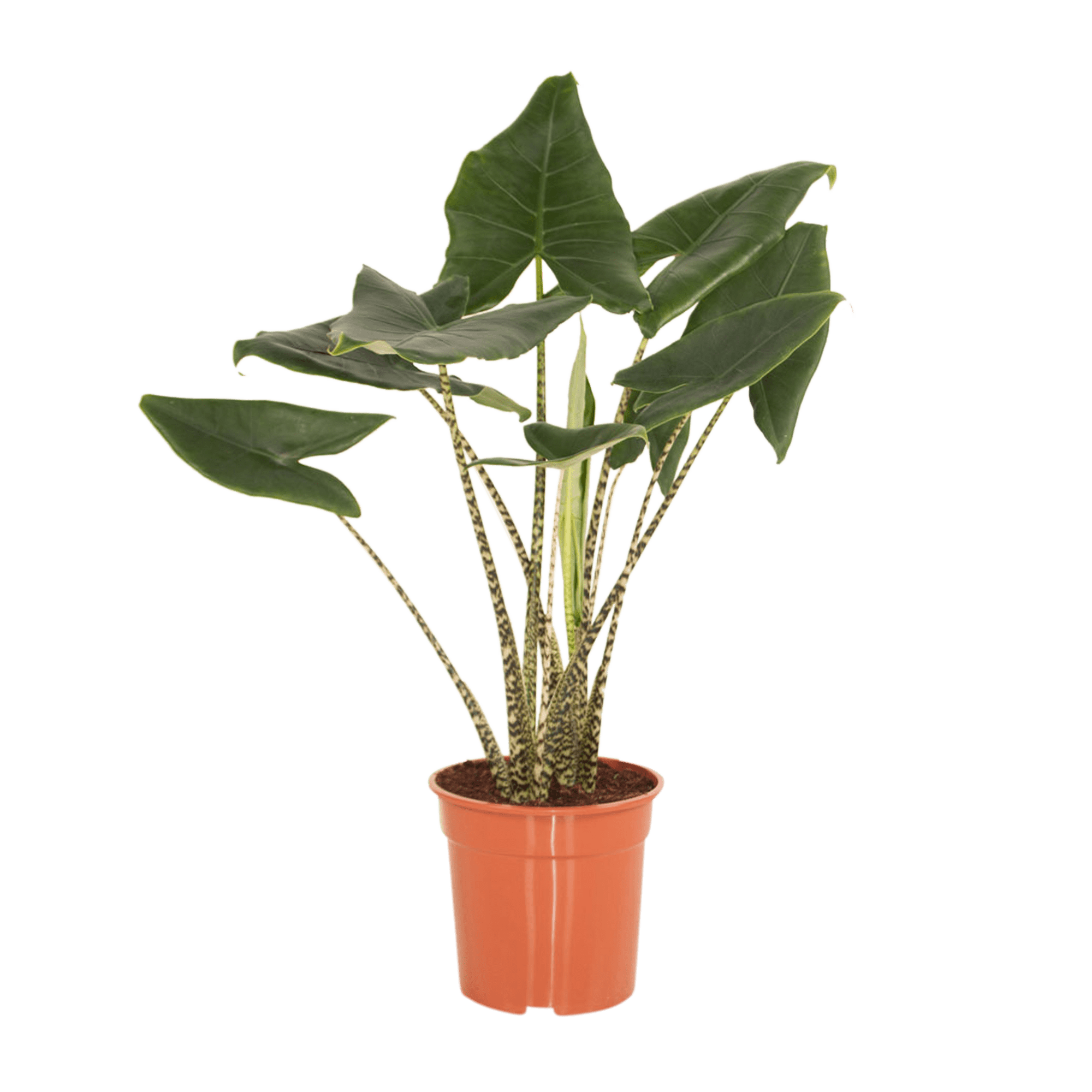 De gestreepte stengels van de Alocasia Zebrina lijken op het patroon van zebra’s. De aparte stelen in combinatie met zijn prachtige hartvormige, groene bladeren zijn kenmerkend voor deze Alocasia. Deze plant is geen snelle groeier.
