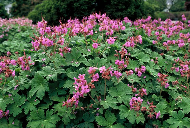 Geranium macrorrhizum of ooievaarsbek is een vaste plant met kleverige groene ingesneden bladeren. Bij aanraking komt er een aromatische geur vrij. Deze geur houdt katten op afstand. Geranium macrorrhizum bloeit van mei tot met juni met roze-rode bloemen met opvallende felle meeldraden. Als je de uitgebloeide bloemen wegknipt, bevorder je een tweede groei. Geraniums trekken vlinders en bijen aan. Deze tuinplant is wintergroen in zachte winters. In de herfst en winter kleuren de bladeren rood. Dit type ooievaarsbek is geschikt als bodembedekker onder struiken en bomen. De plant breidt zich snel uit met zijn ondergrondse wortels en vormt een dicht tapijt. Onkruid krijgt hierdoor geen kans meer. De maximale planthoogte is circa 40 cm.