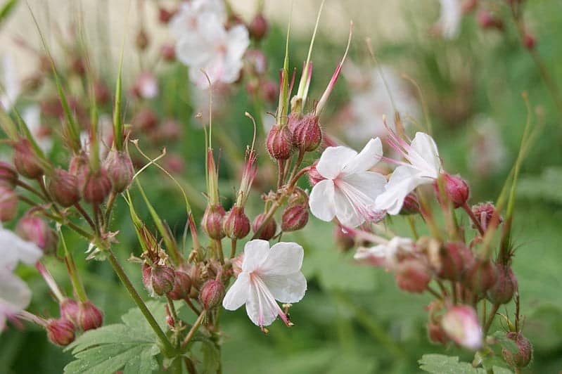 Geranium macrorrhizum ‘Spessart’ of ooievaarsbek is een vaste plant met kleverige groene ingesneden bladeren. Bij aanraking komt er een aromatische geur vrij. Deze geur houdt katten op afstand. Geranium macrorrhizum ‘Spessart’ bloeit van mei tot met juni met witte of lichtroze bloemen met opvallende felle meeldraden. Als je de uitgebloeide bloemen wegknipt, bevorder je een tweede groei. Geraniums trekken vlinders en bijen aan. Deze tuinplant is wintergroen in zachte winters. In de herfst en winter kleuren de bladeren rood. Dit type ooievaarsbek is geschikt als bodembedekker onder struiken en bomen. De plant breidt zich snel uit met zijn ondergrondse wortels en vormt een dicht tapijt. Onkruid krijgt hierdoor geen kans meer. De maximale planthoogte is circa 40 cm.
