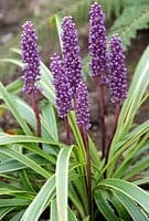 Liriope muscari ‘Variegata’, een leliegras, verschilt van de soort door het in de lengterichting witbont gestreepte blad. Liriope muscari ‘Variegata’ heeft net als de soort een grasachtig maar wintergroen blad.